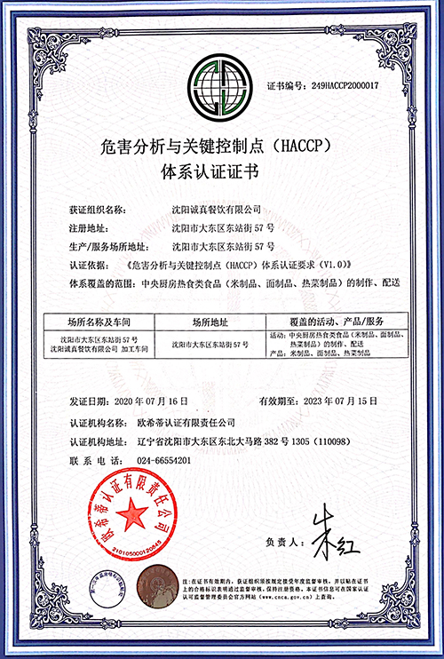 危害分析與關(guān)鍵控制點(HACCP)體系認(rèn)證證書